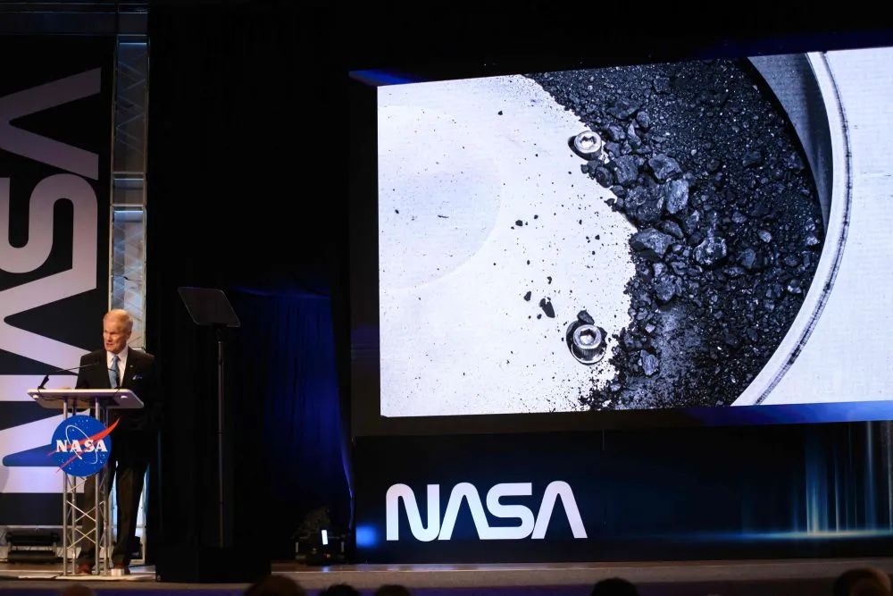 2023年10月11日,在美国休斯敦约翰逊航天中心,美国国家航空航天局首次向公众展示从小行星贝努采集到的样本的图片和视频。新华社/法新